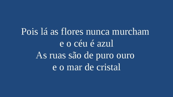 - Pois lá as flores nunca murcham e o céu é azulAs ruas são de puro ouro e o mar de cristal
