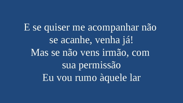 - E se quiser me acompanhar não se acanhe, venha já!Mas se não vens irmão, com sua permissãoEu vou rumo àquele lar