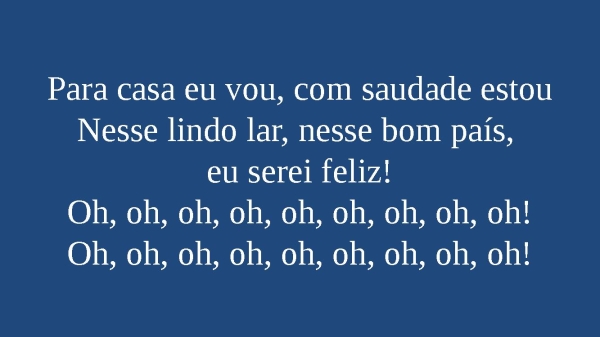 - Para casa eu vou, com saudade estouNesse lindo lar, nesse bom país, eu serei feliz!Oh, oh, oh, oh, oh, oh, oh, oh, oh!Oh, oh, oh, oh, oh, oh, oh, oh, oh!