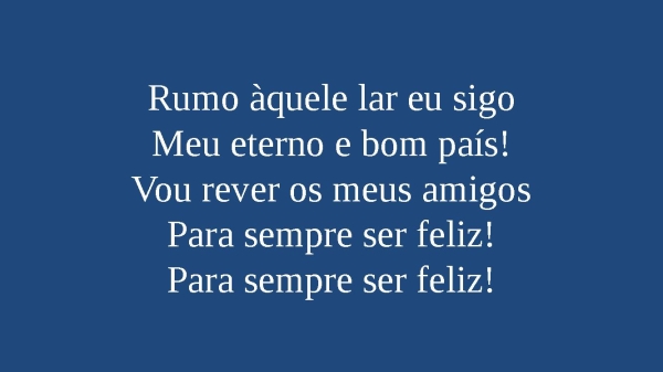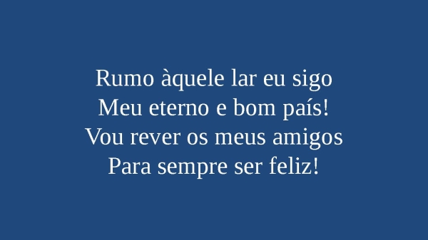 - Rumo àquele lar eu sigoMeu eterno e bom país!Vou rever os meus amigosPara sempre ser feliz!Para sempre ser feliz!