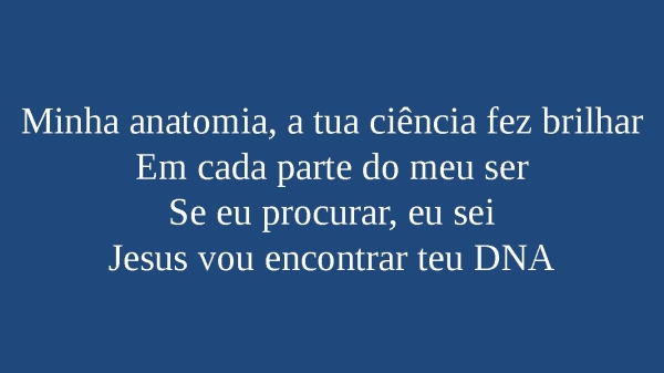 - Minha anatomia, a tua ciência fez brilharEm cada parte do meu serSe eu procurar, eu seiJesus vou encontrar teu DNA