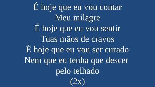 - É hoje que eu vou contarMeu milagreÉ hoje que eu vou sentirTuas mãos de cravosÉ hoje que eu vou ser curadoNem que eu tenha que descer pelo telhado(2x)