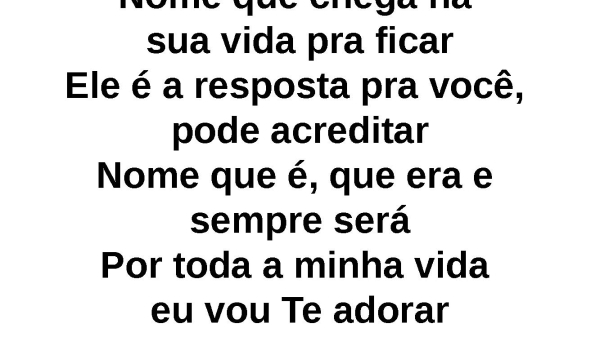 - Nome que chega na sua vida pra ficarEle é a resposta pra você, pode acreditarNome que é, que era e sempre seráPor toda a minha vida eu vou Te adorar
