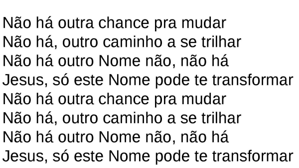 - Não há outra chance pra mudar.Não há, outro caminho a se trilharNão há outro Nome não, não háSó este Nome pode te transformar