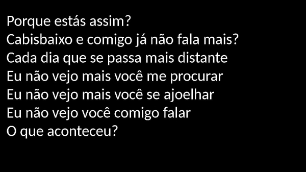 - Porque estás assim?Cabisbaixo e comigo já não fala mais?Cada dia que se passa mais distanteEu não vejo mais você me procurarEu não vejo mais você se ajoelharEu não vejo você comigo falarO que aconteceu?