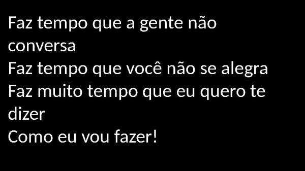 - Faz tempo que a gente não conversaFaz tempo que você não se alegraFaz muito tempo que eu quero te dizerComo eu vou fazer!