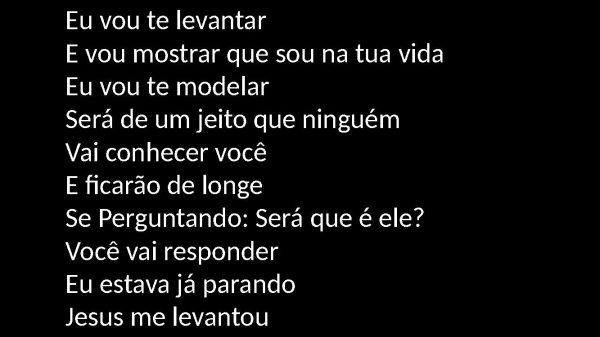 - Eu vou te levantarE vou mostrar que sou na tua vidaEu vou te modelarSerá de um jeito que ninguémVai conhecer vocêE ficarão de longeSe Perguntando: Será que é ele?Você vai responderEu estava já parandoJesus me levantou