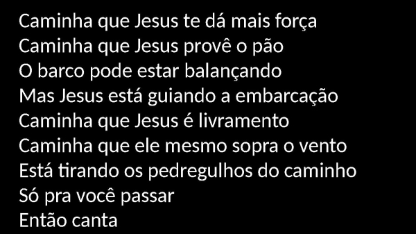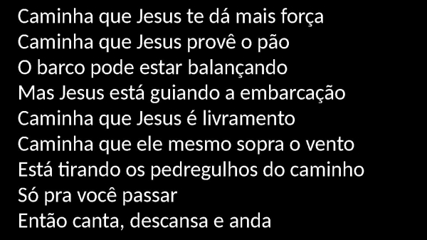 - Caminha que Jesus te dá mais forçaCaminha que Jesus provê o pãoO barco pode estar balançandoMas Jesus está guiando a embarcaçãoCaminha que Jesus é livramentoCaminha que ele mesmo sopra o ventoEstá tirando os pedregulhos do caminhoSó pra você passarEntão canta