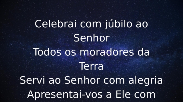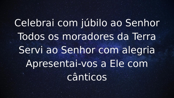 - Celebrai com júbilo ao SenhorTodos os moradores da TerraServi ao Senhor com alegriaApresentai-vos a Ele com cânticos