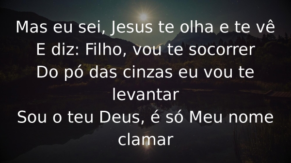 - Mas eu sei, Jesus te olha e te vêE diz: Filho, vou te socorrerDo pó das cinzas eu vou te levantarSou o teu Deus, é só Meu nome clamar