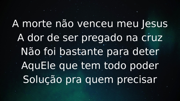 - A morte não venceu meu JesusA dor de ser pregado na cruzNão foi bastante para deterAquEle que tem todo poderSolução pra quem precisar