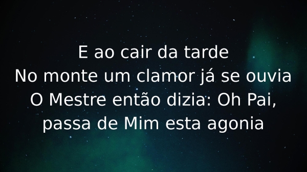 - E ao cair da tardeNo monte um clamor já se ouviaO Mestre então dizia: Oh Pai, passa de Mim esta agonia