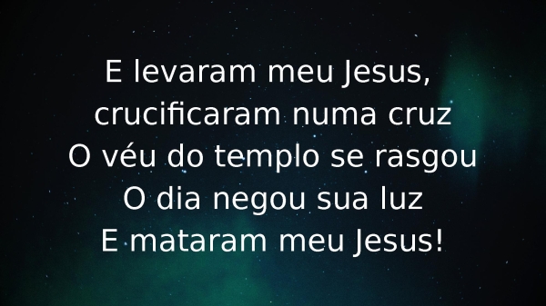 - E levaram meu Jesus, crucificaram numa cruzO véu do templo se rasgouO dia negou sua luzE mataram meu Jesus!