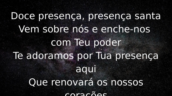 - Doce presença, presença santaVem sobre nós e enche-nos com o teu poderTe adoramos por tua presença aquiE que renovará os nossos coraçõesLouvado seja o senhor