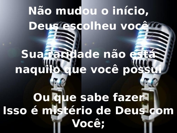 - Não mudou o início,Deus escolheu vocêSua raridade não estánaquilo que você possuiOu que sabe fazerIsso é mistério de Deus com Você;