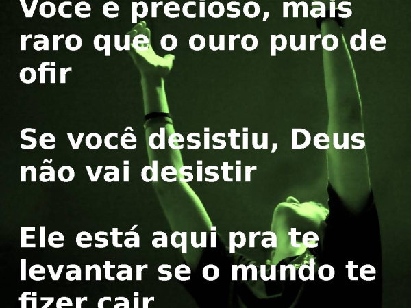 - Você é precioso, mais raro que o ouro puro de ofirSe você desistiu, Deus não vai desistirEle está aqui pra te levantar se o mundo te fizer cair