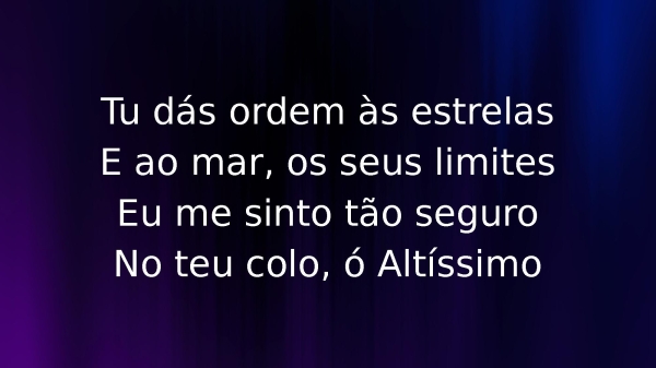 - Tu dás ordem às estrelasE ao mar, os seus limitesEu me sinto tão seguroNo teu colo, ó Altíssimo