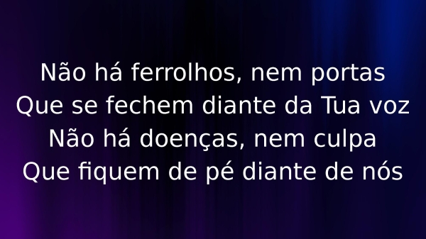 - Não há ferrolhos, nem portasQue se fechem diante da Tua vozNão há doenças, nem culpaQue fiquem de pé diante de nós