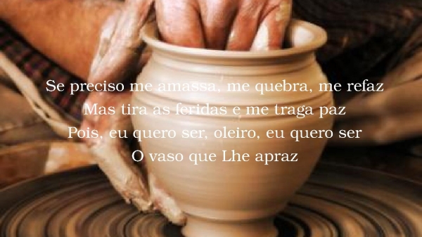 - Se preciso me amassa, me quebra, me refazMas tira as feridas e me traga pazPois, eu quero ser, oleiro, eu quero serO vaso que Lhe apraz