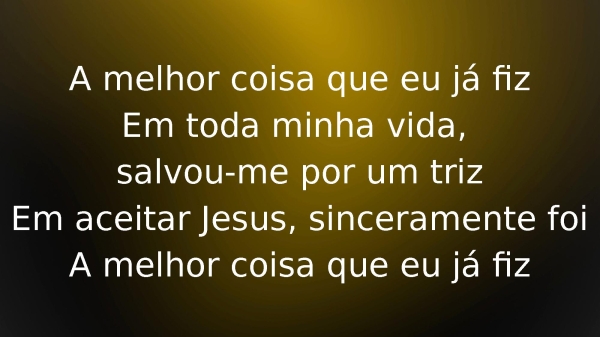 - A melhor coisa que eu já fizEm toda minha vida, salvou-me por um trizEm aceitar Jesus, sinceramente foiA melhor coisa que eu já fiz
