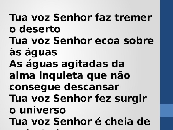 - Tua voz Senhor faz tremer o desertoTua voz Senhor ecoa sobre às águasAs águas agitadas da alma inquieta que não consegue descansarTua voz Senhor fez surgir o universoTua voz Senhor é cheia de majestadeEla aponta a direção, dissipa toda confusão e traz luz na escuridão