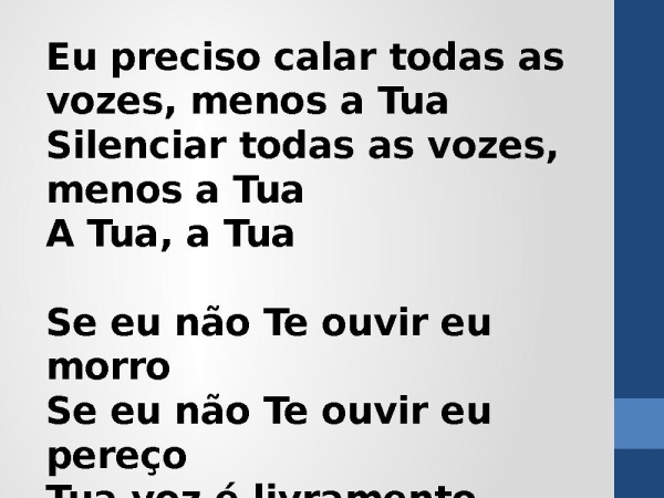 - Mas se eu Te ouvir eu vivoSe eu Te ouvir eu prosperoTua voz é a segurançaNo começo, meio e fimTua voz é tudoPreciso calar todas as vozes, menos a TuaSilenciar todas as vozes, menos a TuaA Tua, a Tua