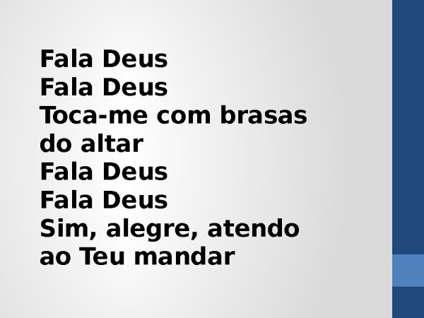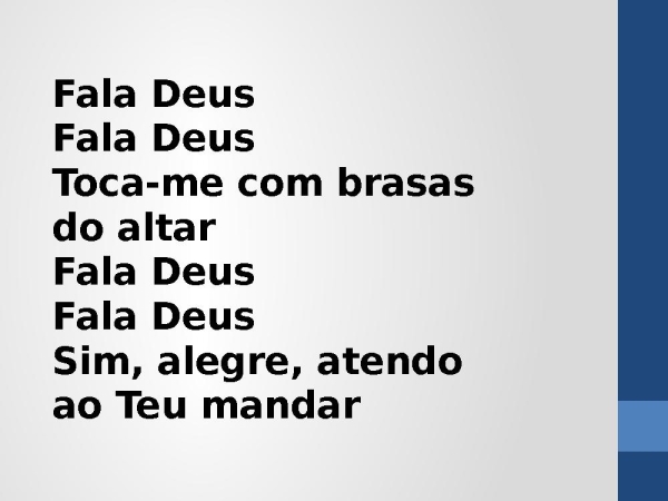 - Fala DeusFala DeusToca-me com brasas do altarFala DeusFala DeusSim, alegre, atendo ao Teu mandar