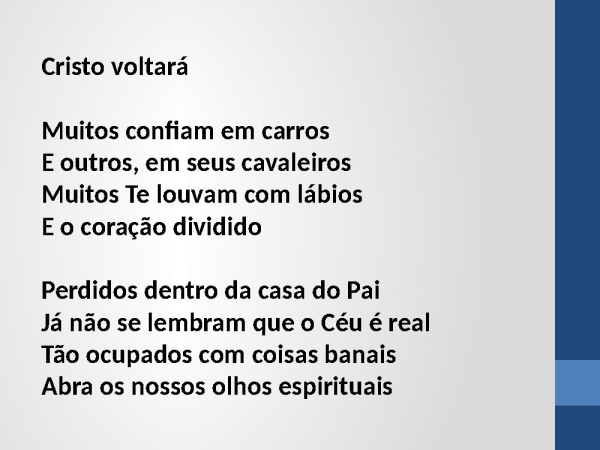 - Cristo voltaráMuitos confiam em carrosE outros, em seus cavaleirosMuitos Te louvam com lábiosE o coração divididoPerdidos dentro da casa do PaiJá não se lembram que o Céu é realTão ocupados com coisas banaisAbra os nossos olhos espirituais