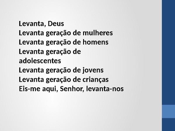 - Levanta, DeusLevanta geração de mulheresLevanta geração de homensLevanta geração de adolescentesLevanta geração de jovensLevanta geração de criançasEis-me aqui, Senhor, levanta-nos