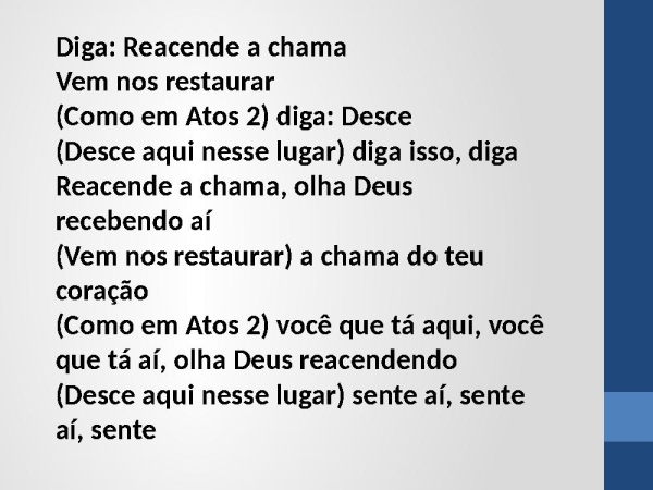 - Diga: Reacende a chamaVem nos restaurar(Como em Atos 2) diga: Desce(Desce aqui nesse lugar) diga isso, digaReacende a chama, olha Deus recebendo aí(Vem nos restaurar) a chama do teu coração(Como em Atos 2) você que tá aqui, você que tá aí, olha Deus reacendendo(Desce aqui nesse lugar) sente aí, sente aí, sente