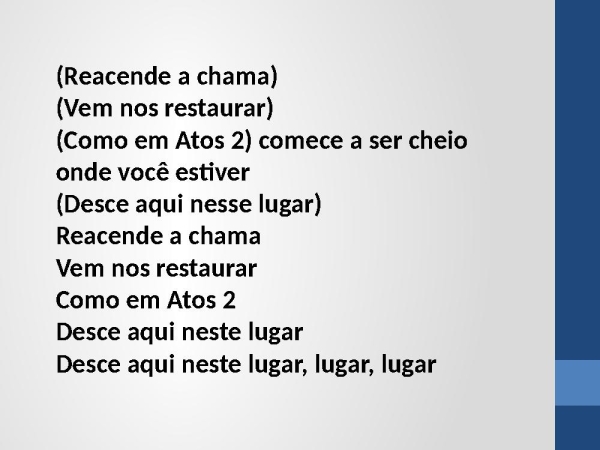 - (Reacende a chama)(Vem nos restaurar)(Como em Atos 2) comece a ser cheio onde você estiver(Desce aqui nesse lugar)Reacende a chamaVem nos restaurarComo em Atos 2Desce aqui neste lugarDesce aqui neste lugar, lugar, lugar