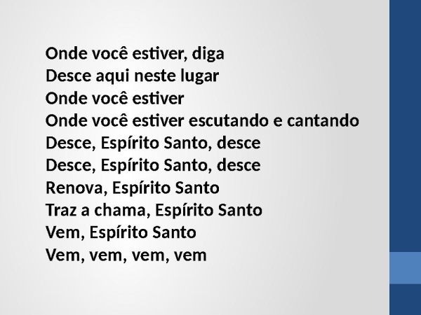 - Onde você estiver, digaDesce aqui neste lugarOnde você estiverOnde você estiver escutando e cantandoDesce, Espírito Santo, desceDesce, Espírito Santo, desceRenova, Espírito SantoTraz a chama, Espírito SantoVem, Espírito SantoVem, vem, vem, vem