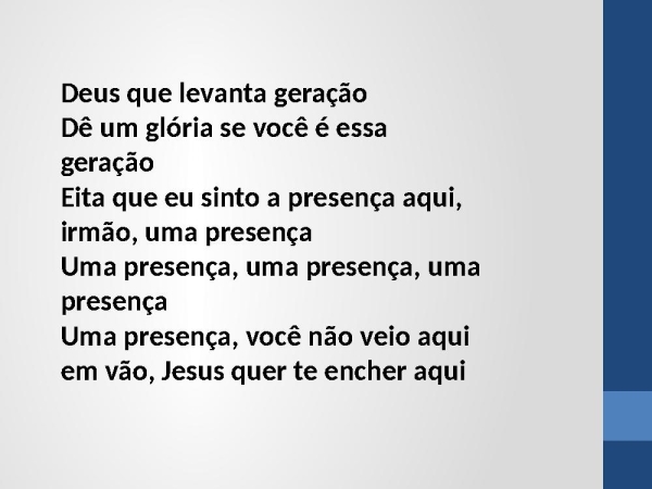 - Deus que levanta geraçãoDê um glória se você é essa geraçãoEita que eu sinto a presença aqui, irmão, uma presençaUma presença, uma presença, uma presençaUma presença, você não veio aqui em vão, Jesus quer te encher aqui