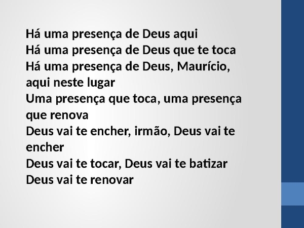 - Há uma presença de Deus aquiHá uma presença de Deus que te tocaHá uma presença de Deus, Maurício, aqui neste lugarUma presença que toca, uma presença que renovaDeus vai te encher, irmão, Deus vai te encherDeus vai te tocar, Deus vai te batizarDeus vai te renovar