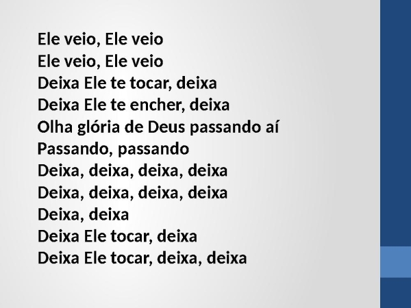 - Ele veio, Ele veioEle veio, Ele veioDeixa Ele te tocar, deixaDeixa Ele te encher, deixaOlha glória de Deus passando aíPassando, passandoDeixa, deixa, deixa, deixaDeixa, deixa, deixa, deixaDeixa, deixaDeixa Ele tocar, deixaDeixa Ele tocar, deixa, deixa