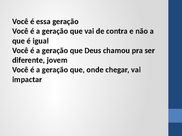 - Você é essa geraçãoVocê é a geração que vai de contra e não a que é igualVocê é a geração que Deus chamou pra ser diferente, jovemVocê é a geração que, onde chegar, vai impactar