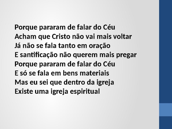 - Porque pararam de falar do CéuAcham que Cristo não vai mais voltarJá não se fala tanto em oraçãoE santificação não querem mais pregarPorque pararam de falar do CéuE só se fala em bens materiaisMas eu sei que dentro da igrejaExiste uma igreja espiritual