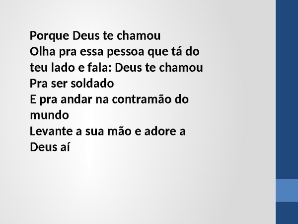 - Porque Deus te chamouOlha pra essa pessoa que tá do teu lado e fala: Deus te chamouPra ser soldadoE pra andar na contramão do mundoLevante a sua mão e adore a Deus aí