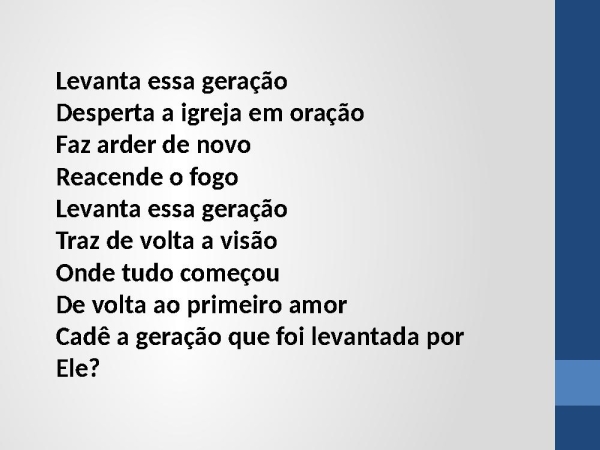 - Levanta essa geraçãoDesperta a igreja em oraçãoFaz arder de novoReacende o fogoLevanta essa geraçãoTraz de volta a visãoOnde tudo começouDe volta ao primeiro amorCadê a geração que foi levantada por Ele?