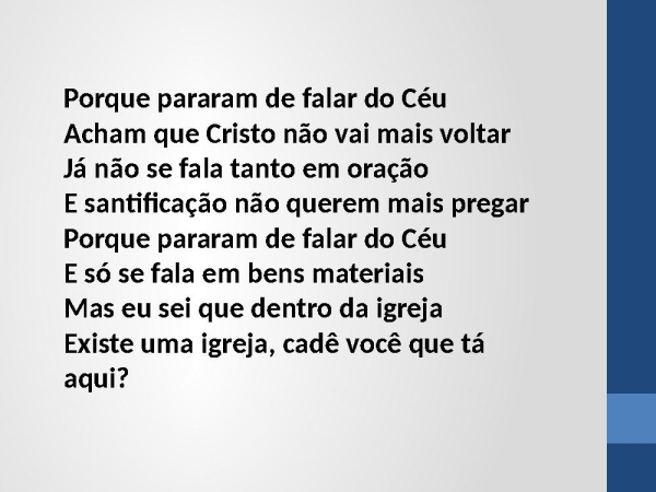 - Porque pararam de falar do CéuAcham que Cristo não vai mais voltarJá não se fala tanto em oraçãoE santificação não querem mais pregarPorque pararam de falar do CéuE só se fala em bens materiaisMas eu sei que dentro da igrejaExiste uma igreja, cadê você que tá aqui?