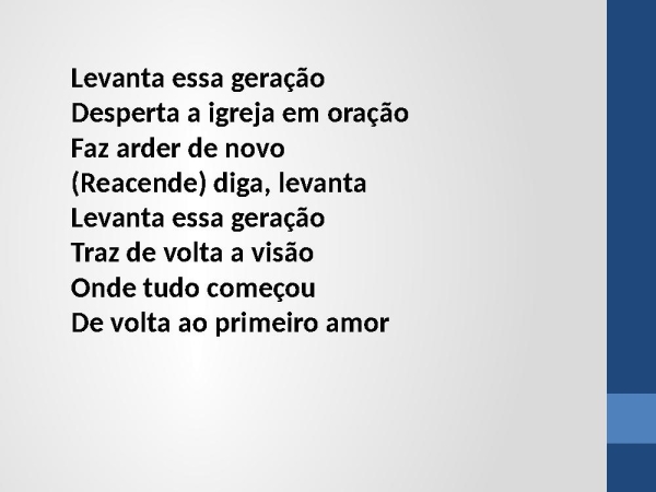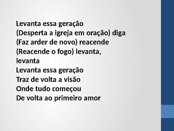 - Levanta essa geraçãoDesperta a igreja em oraçãoFaz arder de novo(Reacende) diga, levantaLevanta essa geraçãoTraz de volta a visãoOnde tudo começouDe volta ao primeiro amor