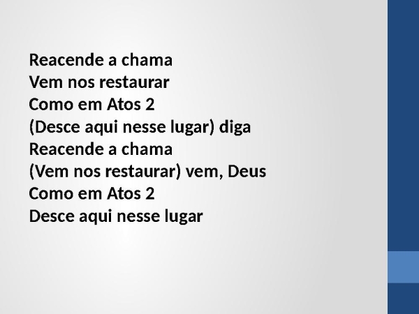 - Reacende a chamaVem nos restaurarComo em Atos 2(Desce aqui nesse lugar) digaReacende a chama(Vem nos restaurar) vem, DeusComo em Atos 2Desce aqui nesse lugar