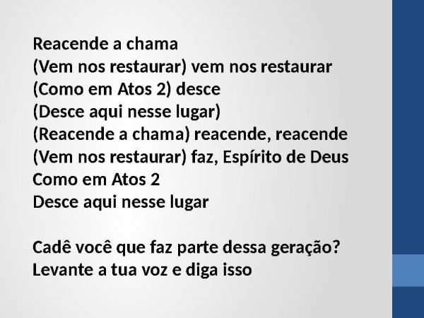 - Reacende a chama(Vem nos restaurar) vem nos restaurar(Como em Atos 2) desce(Desce aqui nesse lugar)(Reacende a chama) reacende, reacende(Vem nos restaurar) faz, Espírito de DeusComo em Atos 2Desce aqui nesse lugarCadê você que faz parte dessa geração?Levante a tua voz e diga isso