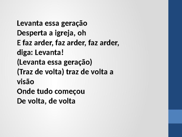 - Levanta essa geraçãoDesperta a igreja, ohE faz arder, faz arder, faz arder, diga: Levanta!(Levanta essa geração)(Traz de volta) traz de volta a visãoOnde tudo começouDe volta, de volta