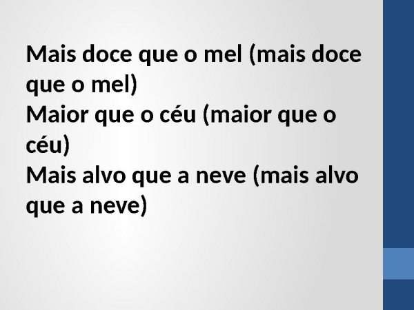 - Mais doce que o mel (mais doce que o mel)Maior que o céu (maior que o céu)Mais alvo que a neve (mais alvo que a neve)