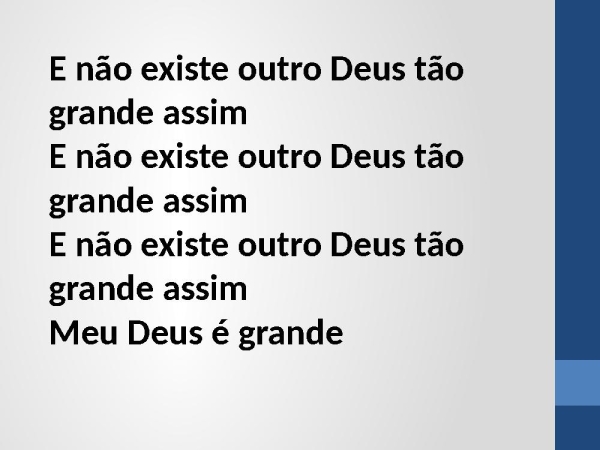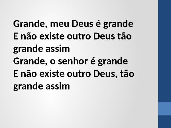 - Grande, meu Deus é grandeE não existe outro Deus tão grande assimGrande, o senhor é grandeE não existe outro Deus, tão grande assim