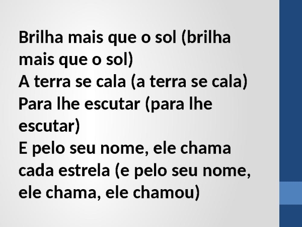 - Brilha mais que o sol (brilha mais que o sol)A terra se cala (a terra se cala)Para lhe escutar (para lhe escutar)E pelo seu nome, ele chama cada estrela (e pelo seu nome, ele chama, ele chamou)