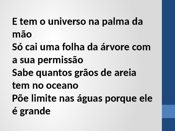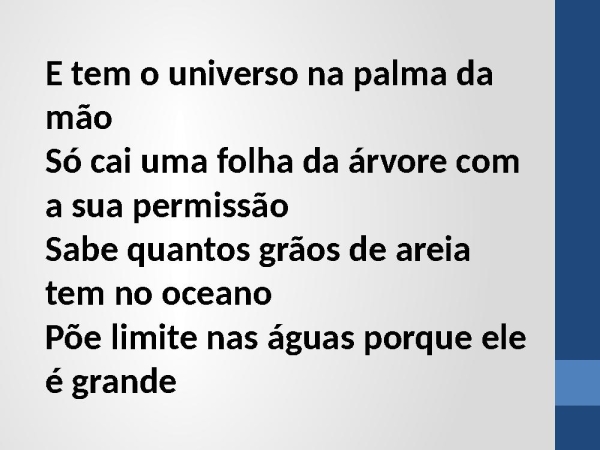 - E tem o universo na palma da mãoSó cai uma folha da árvore com a sua permissãoSabe quantos grãos de areia tem no oceanoPõe limite nas águas porque ele é grande