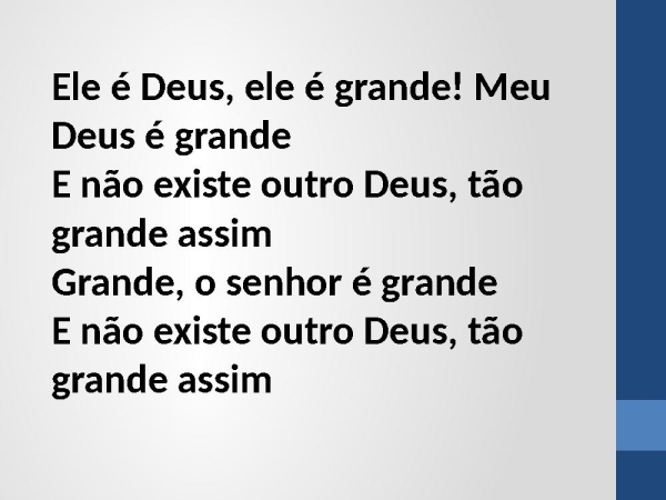 - Ele é Deus, ele é grande! Meu Deus é grandeE não existe outro Deus, tão grande assimGrande, o senhor é grandeE não existe outro Deus, tão grande assim