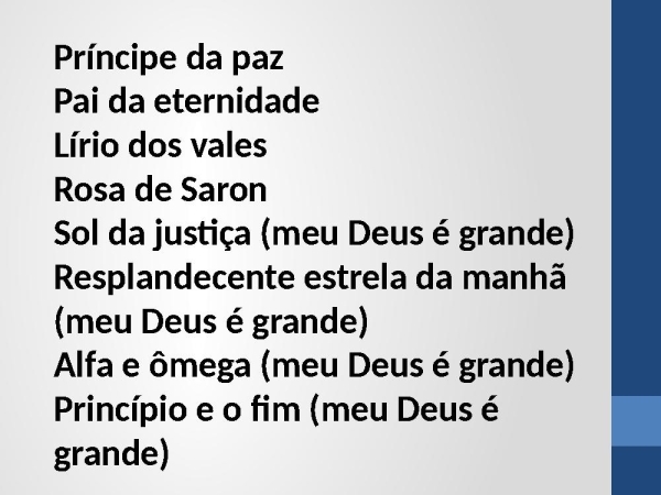 - Príncipe da pazPai da eternidadeLírio dos valesRosa de SaronSol da justiça (meu Deus é grande)Resplandecente estrela da manhã (meu Deus é grande)Alfa e ômega (meu Deus é grande)Princípio e o fim (meu Deus é grande)